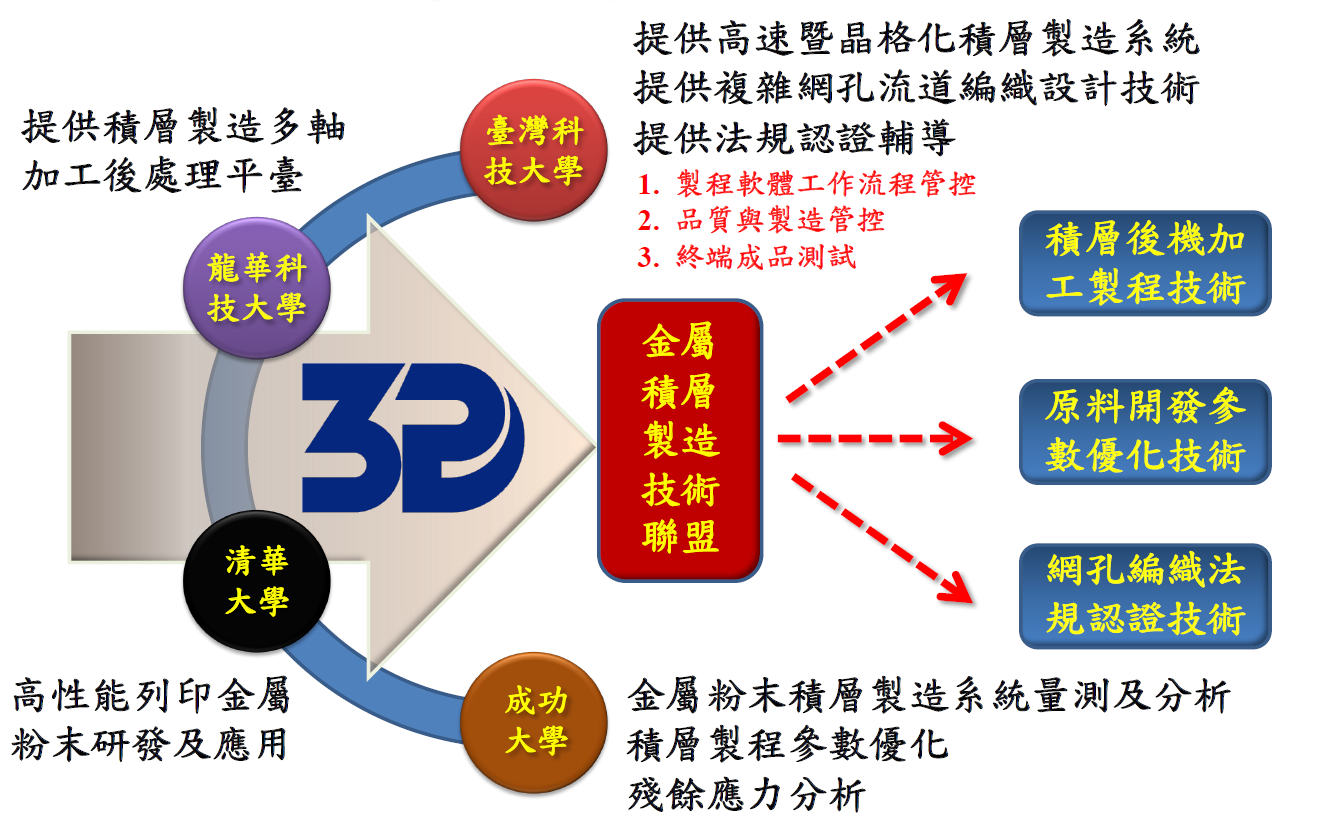 聯盟透過國科會產業聯盟計畫的經費補助,由臺灣科技大學、龍華科技大學、清華大學及成功大學組成。擁有豐沛積層製造系統技術、設備與應用經驗,且具媒合產學合作與系統化提升產業積層製造的能力。